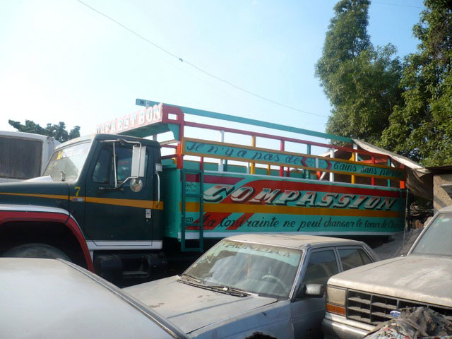图6:二零零八年至二零零九年,这辆标有“法轮大法好”、“真、善、忍”的卡车穿越海地,所到之处,司机向人们赠送传单,传播法轮功真相。 |