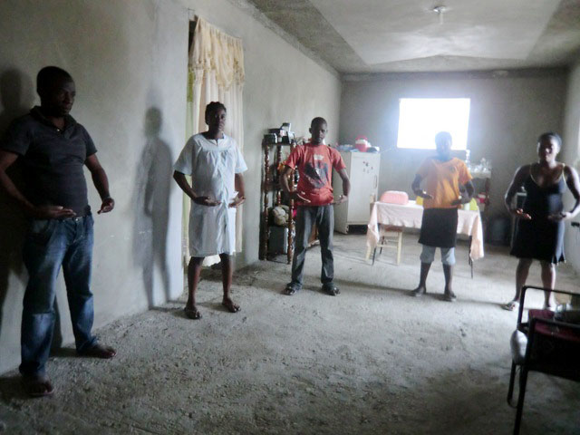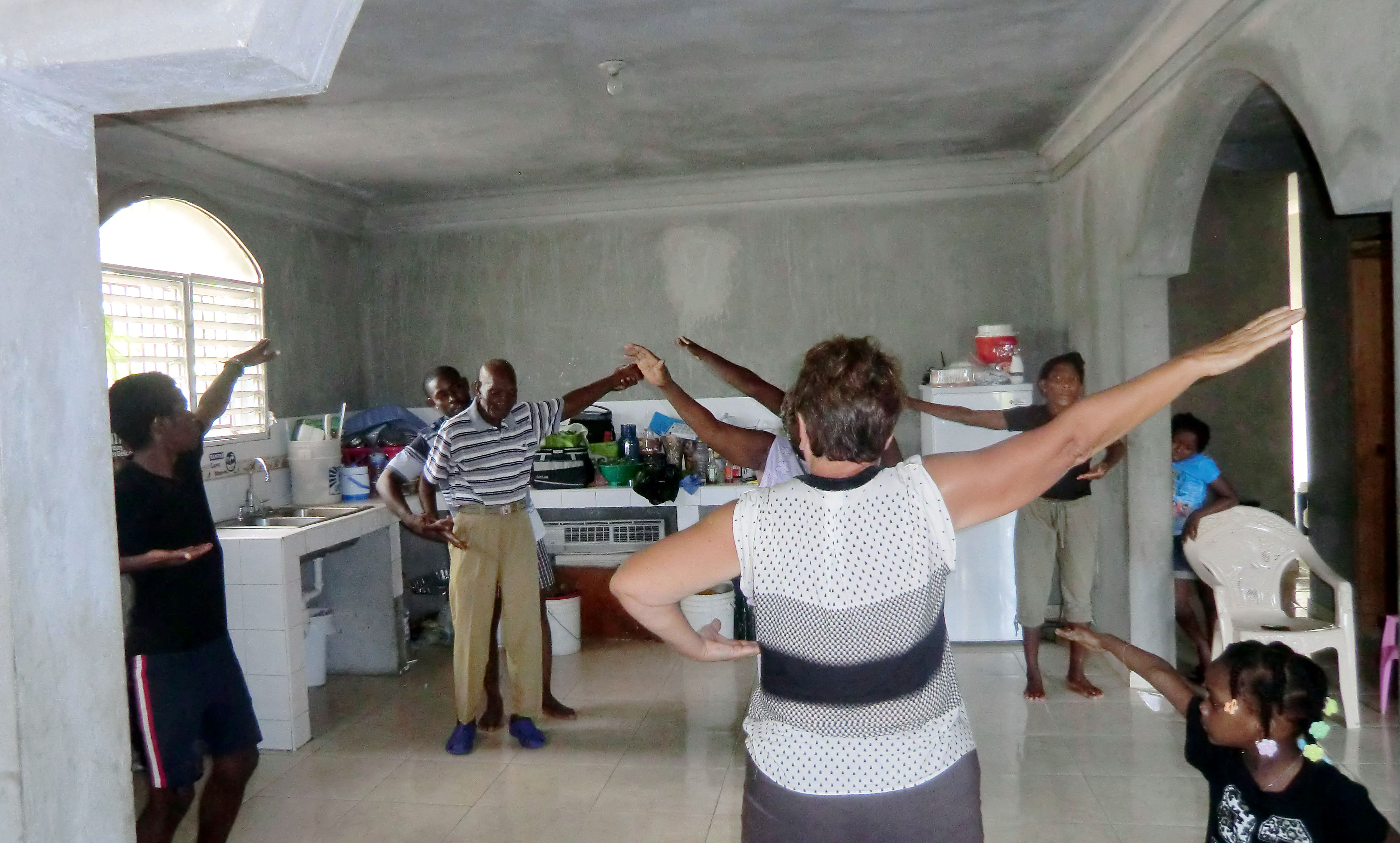 法轮功学员阿妮塔二零一四年夏天又一次来到海地,这是她第四次踏上这片土地了。海地在重建,炼法轮功的人数日益增加,已经有好几组人修炼法轮功了。  图9:阿妮塔和老奶奶一家人一起炼功(二零一四年) |