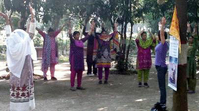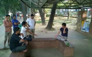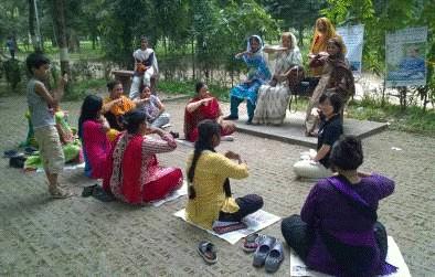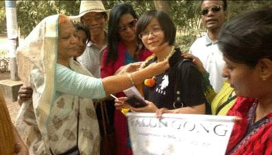 二零一四年十一月七日,Smirty在公园跟着小李学功,做到第三套功法时,她就大声地说:“神清气爽!神清气爽!(refresh! refresh!)”简单学了一遍五套功法后,她走上前来告诉小李:“我感觉自己象在天堂一样(I feel that I am in the heaven)。”接着她一把拥抱住小李,感激和喜悦的心情难以言表。小李把介绍法轮大法的单张资料给了Smirty,并简述了法轮功学员在中国无辜受迫害的情况。Smirty告诉小李,她是从政的,不喜欢共产主义。 “你心地善良,所以神与你相连”  图2:二零一四年十一月八日,法轮功学员在Ramna公园内教功弘法,Tajkerak身着浅色莎丽坐在石凳中间 |