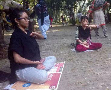 晨炼时间结束时,大家依依惜别,拿出手机来要和小李合影留念。小李忙着给大家写下法轮功学员老罗的联系方式。这时Tajkerak拿出一个花环来,戴在小李的脖子上。Tajkerak告诉小李,她的先生是一位来自中国的针灸师,他们夫妇俩一直在当地推崇传统中医。 “感谢神让我今天遇到你” 小李最后一天在Ramna公园弘法,Shukhy、Painu、Mili和Asmejama最先坐下来跟她学炼法轮功第五套功法。Shukhy和Painu一上来就能轻松双盘。小李教她们打完手印后,试着将加持的时间加长了一点,这时她感觉到了非常祥和平静的能量场,睁开眼看到她们各个面带祥和,内心感谢师父将有缘人带到了自己的身边,因为小李原本打算今天去Lake Park炼功弘法的。她拿出手机拍下了这美好的瞬间。 随后陆陆续续有更多的孟加拉妇女坐下学功。第五套功法结束后,小李问她们是否感觉到了能量场,因为她们的表情看起来非常的祥和。她们频频点头。  图4:Shukhy (右) 和Painu(左)第一次学法轮功第五套功法就能双盘并感受到了能量 |