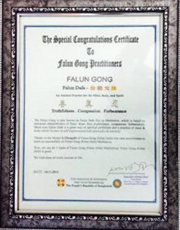 新学员Msksud希望有一天能读到孟加拉语的法轮大法书。自从在Dhanmondi Lake Park跟着老罗学炼法轮功以来,无论老罗去远的Ramna Park,还是近的Dhanmondi Lake Park,Msksud必定到场一起炼功。他是个有求道之心的年轻人。Msksud的英文比较有限,特别希望能早日读到孟加拉文的大法书。 行政长官签署褒奖:感谢李老师  图6:行政长官签署的感谢李洪志大师的感谢信 |
