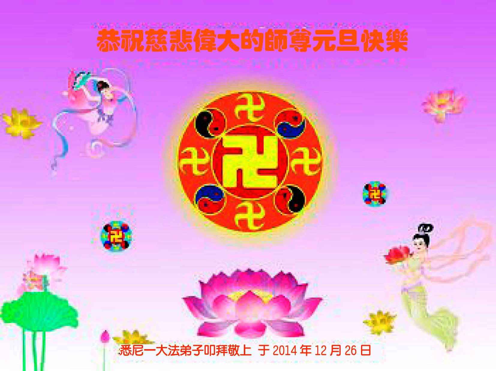 感恩师父无量慈悲,大法弟子们精進实修,做好三件事,多救人!澳洲悉尼大法弟子敬献 2014年12月29日 澳洲悉尼一大法弟子恭祝慈悲伟大的师尊元旦快乐!