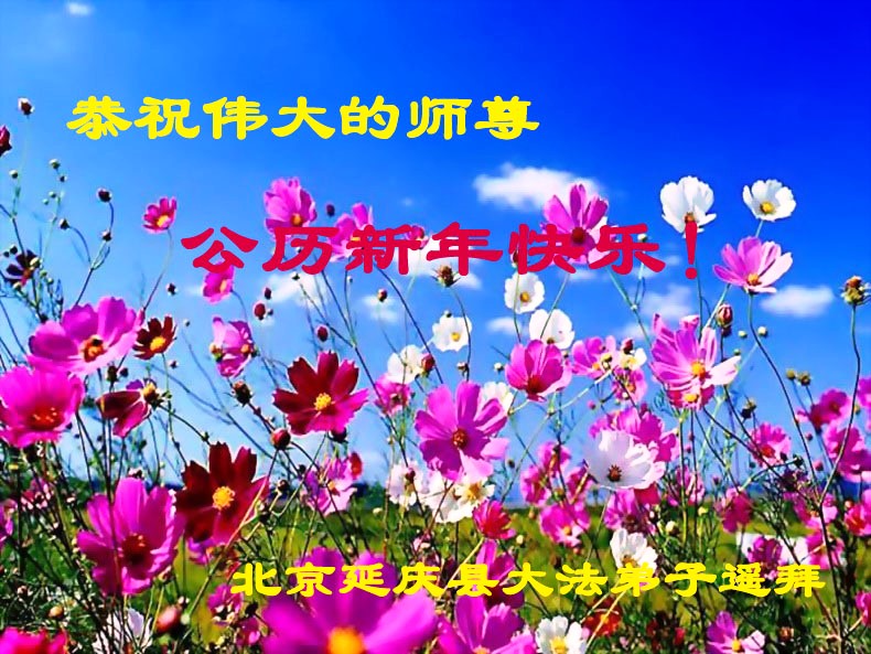 新年即将到来,大法弟子非常想念师父,并向慈悲伟大的师父问好,恭祝师父元旦快乐。 北京朝阳金盏地区、黑桥地区、东坝地区、双井地区和管庄地区大法弟子 北京市延庆县全体大法弟子恭祝慈悲伟大的师父新年快乐!