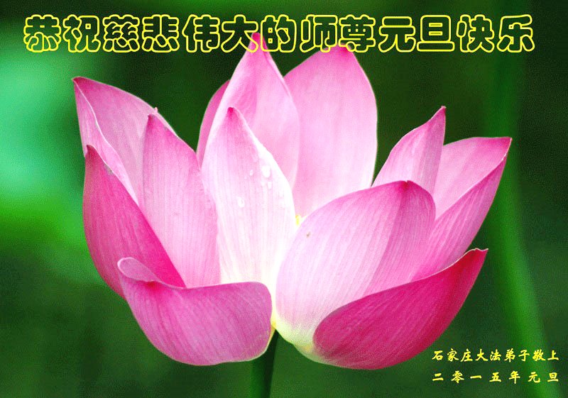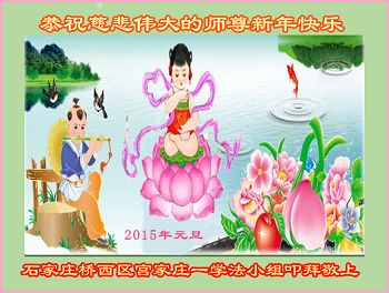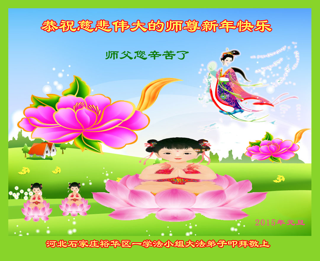 2015年元旦到了,我们怀着深深感恩之情向恩师致节日的祝贺!新的一年又开始了,在新的一年里,我们一定谨遵师教,多学法,学好法,认认真真同化大法,努力做好三件事,真正做到修炼如初,跟上正法進程,兑现史前誓约,跟随师尊圆满回家!最后以一首短诗敬上,以表达我们的心志: 恭祝恩师新年好 元旦到 众欢笑 锣鼓喧天震九霄 笙萧歌舞起春潮 大法弟子同敬拜 恭祝恩师新年好 三件事 定做好 风吹浪打不动摇 严寒酷暑志更高 修炼如初遵师教 回归航程奋臂摇 河北省石家庄市无极县大法弟子祝师尊二零一五年元旦快乐!