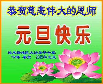 恭祝伟大师尊元旦快乐! 集体学法好,学法惜分秒。 全神贯注读,理性认识高。 集体救人好,互相配合妙。 溶入慈悲中,法救众生笑 集体发正念,败类邪恶消。 叩首感师恩,恭祝师尊好。 佳木斯一学法小组 2015 元旦 黑龙江佳木斯市夫妇大法弟子恭祝师尊新年快乐!