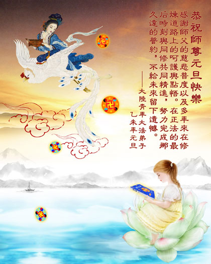 师恩浩荡传法来,得法修心身自安; 全家都是法弟子,法子师尊心相连; 师尊普度一年年,三拜九叩贺新年; 弟子祝师新年好,正法必成大团圆。 大陆大法弟子恭祝师尊新年好!