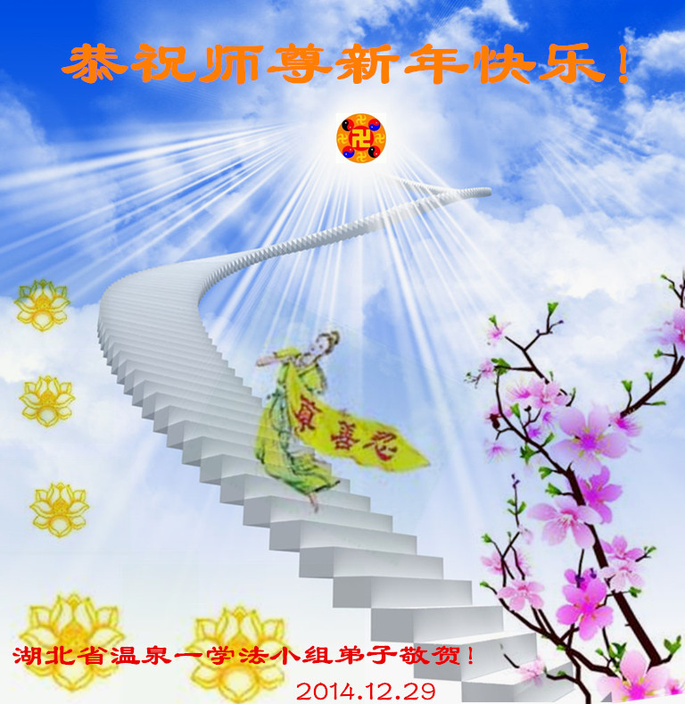 伟大的师尊:祝您元旦快乐! 武汉市三个学法小组、湖北大学大法弟子,在2015年到来之际,向慈悲伟大的师尊,送上节日的问候! 在新的一年里,我们要抓紧时间,在实修自己的同时做好三件事,抢救更多的众生。请师尊放心,我们一定做得到! 湖北省武汉大法弟子恭祝慈悲伟大的师尊新年快乐!