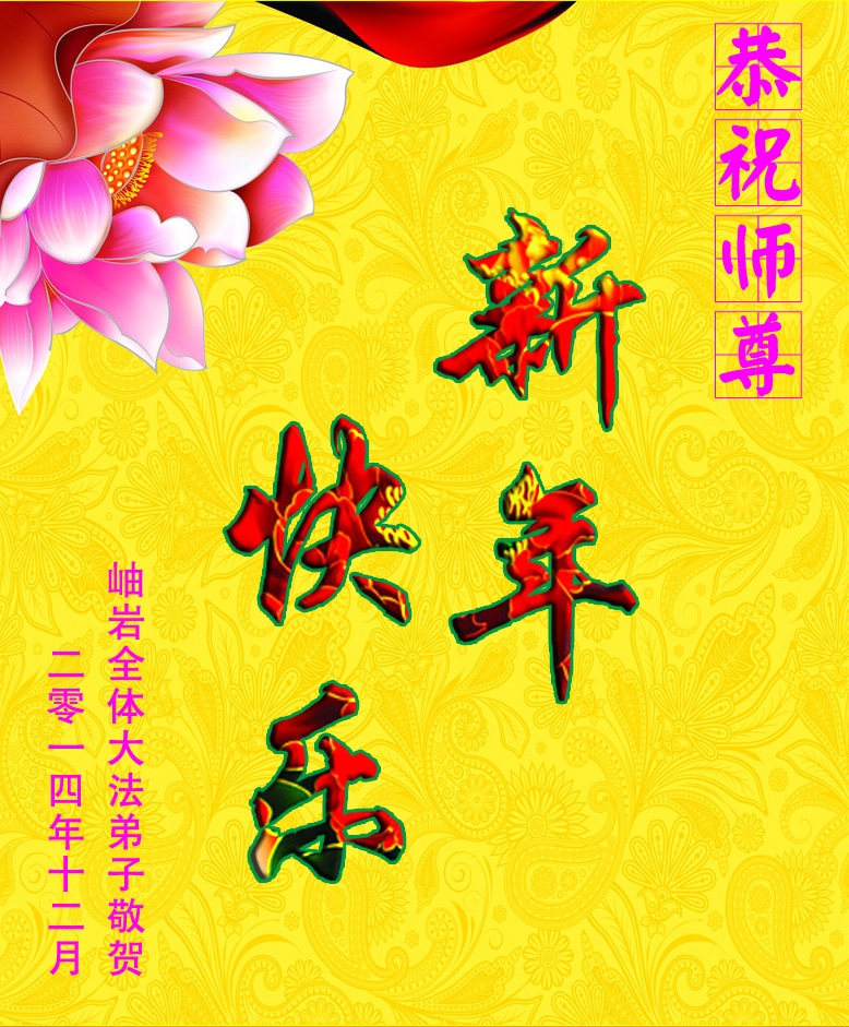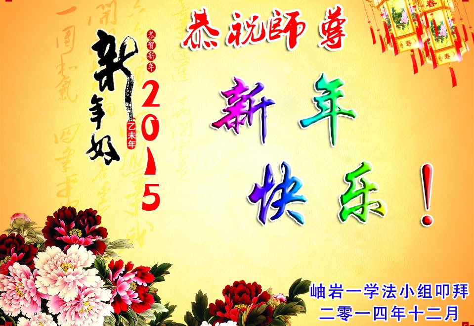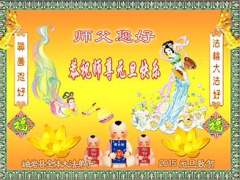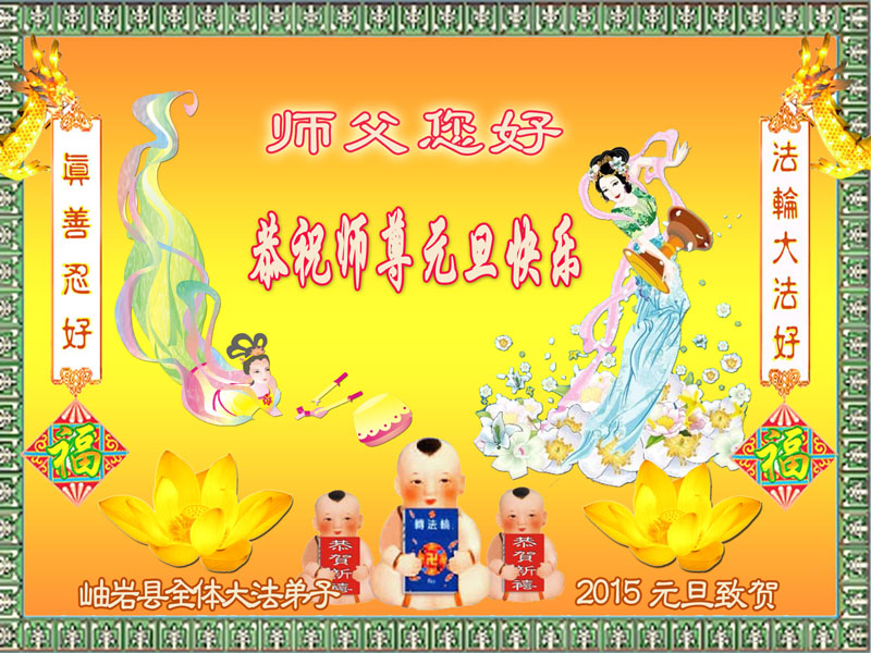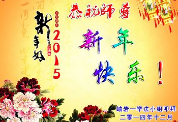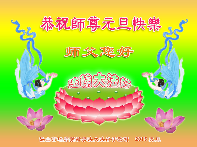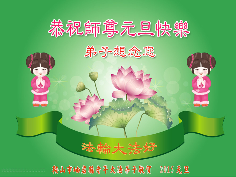 师尊:您好!弟子们想念您! 2015年元旦之际,我们学法小组全体弟子恭祝师父新年快乐!愿师父多一份欣慰,少一份操劳,在新的一年里,我们一定做好三件事,助师正法! 鞍山大法弟子 辽宁省阜新大法弟子恭祝慈悲伟大的师尊新年好!