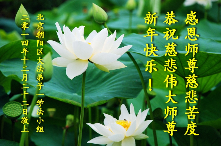 我们是北京大法弟子,在2015年新年来临之际我们衷心恭祝:慈悲伟大的师尊新年好!新年快乐!合十。 北京一家庭学法小组祝师父新年好!