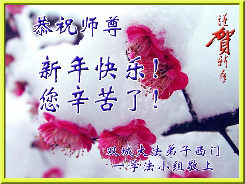 弟子盼望师尊早日归来!在新的一年里,弟子深知肩负的责任重大,时间的紧迫,弟子知道该怎么做,一定兑现誓约完成使命,请师尊放心! 黑龙江省哈尔滨原太平区四人学法小组恭祝师尊元旦快乐!