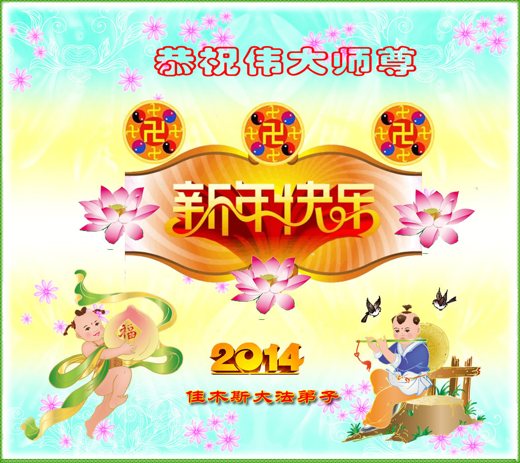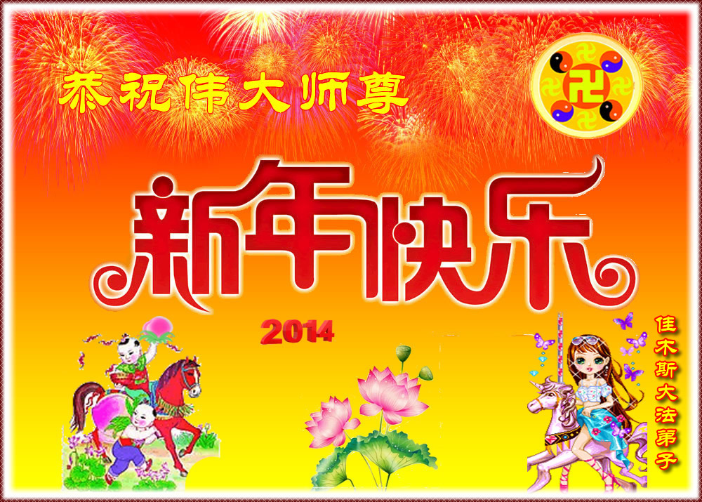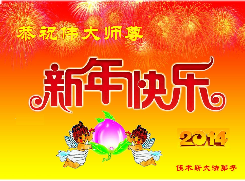 辞旧迎新年, 隔洋表心意。 问声师尊好, 众徒想念您。 晚年得大法, 生命在延期。 时间很宝贵, 时时修自己。 坚定志不移, 小组形整体。 协调配合好, 法徒显神迹。 大力救众生, 得救众生喜。 新年再精進, 叩首谢恩师。 佳木斯佳东学法小组 全体大法弟子 2014.大年 黑龙江省佳木斯全体大法弟子恭祝伟大师尊新年快乐!