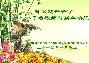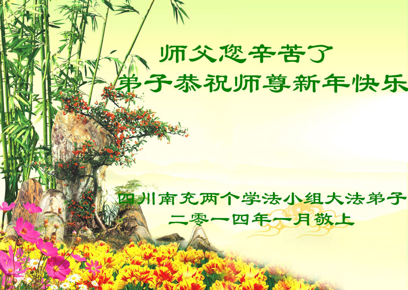 请师尊放心,我们会精進再精進,多救世人,不辜负师尊的慈悲苦度。 四川南充两个学法小组大法弟子恭祝师尊新年快乐!