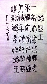 一部天书泛佛光 两极宙宇共辉煌 人修千劫终闻法 神叹万年始谒王 这是家父同修赞美大法、感谢师尊救度之恩的一首格律诗(七绝),诗名叫《谒圣王》,诗句两两对偶,我非常喜欢。今天,我把这首诗用小篆写成书法作品,作为新年礼物奉上师尊。 我非常幸运,从小就出生在大法弟子家庭,从小就聆听师尊讲法录音,从小就学习《洪吟》、《精進要旨》、《转法轮》等大法著作。平时能按照大法的要求,守住心性。现在学校风气很不好,有一次同学从背后袭击我,我无意之中把手背在背后,结果他没打到我,他自己反而跌倒了。一天,比我小一年级的几个学生围着我骂,当时只是觉的他们没有素质,觉的他们可怜,很淡定的没有和他们一般见识。我从小经历几次大的消业痛苦后,师尊把我的身体净化成超常状态。我十分感谢师尊的救度之恩。我换牙时,有这么一件事,我的旧牙没掉,新牙却长出了,新牙都要长歪了。牙医说,这叫早萌,要把牙拔掉。医生要打麻药,我没同意。两颗旧牙就直接拔掉了,我知道自己是炼功人,很平静的对待这件事。由于学校课程繁重,主要是我修炼不精進,学法、炼功不稳定,虽然参加手机讲真相救人,但做三件事亟待提高。今后我一定听师尊的话,努力做好三件事,做一个合格的大法弟子。再一次恭祝慈悲伟大的师尊新年快乐! 江苏大法小弟子真真(14岁) 叩拜! 江苏大法小弟子恭祝慈悲伟大的师尊新年快乐!