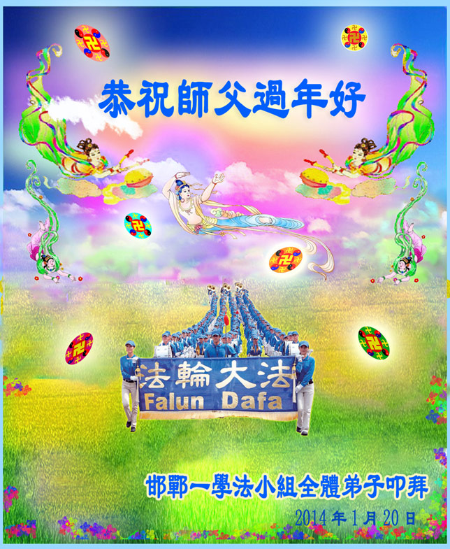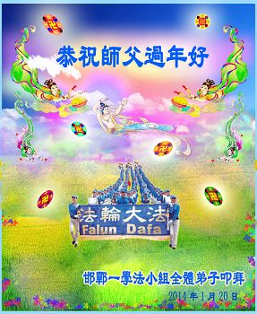 邢台市一资料点和一学法小组大法弟子衷心叩拜慈悲伟大的师父新年好!师父给您拜年啦! 在新的一年里,弟子们要静心学法,做好三件事,要加倍珍惜慈悲伟大的师父用承受换来的机缘,倾尽弟子们的心血与智慧,跟旧势力抢人,广救有缘。请师父放心! 二零一四年一月二十日 恩师笑 - 大陆大法弟子 束心 小花遍开大地艳 俱是用心来浇灌 夜以继日不知倦 真相资料好又全 资料出处须甄选 把握源头最关键 救人网页广而多 师嘱明慧第一源 精心制作功夫显 道道工序藏里面 技术心血加苦悟 更有恩师在呵护 千校万对要仔细 警醒世人抹兽记 准确美观又精致 解体邪*党-增威力 神州大地福音传 红朝灰飞恶世完 众生齐登大法船 慈悲恩师笑开颜 河北省邢台市威县全体大法弟子向慈悲伟大的师父拜年!