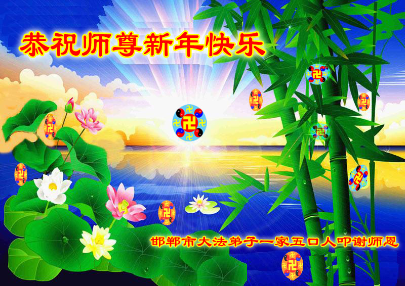 河北邯郸市大法弟子一家五口恭祝慈悲伟大师尊新年快乐!