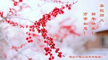 师父:您为救度众生辛苦了! 每逢佳节倍思亲,新年是合家团圆的节日,大陆大法弟子遥望期盼与大洋彼岸慈悲伟大的师尊团聚。万语千言感恩不尽伟大师尊。 大法弟子随师正法又走过了一年,回首正法历程师父无时无刻呵护着我们。魔难中您为大法弟子、为众生承受巨难。弟子每闯一关、每走一步都离不了师父的巨大付出。弟子永永远远也回报不了师父给弟子所做的一切。唯一的只能按照师父要求的做好。 救度众生中兑现誓约,是我们来前时的史愿,我们一定不辜负师尊对弟子的希望,不辜负众生对大法弟子的期盼。在最后不长的时间里做好该做的一切,学好法,多救度众生。少让师父操心。完成好史前大愿,圆满随师父回家。 武汉武昌母女大法弟子 湖北省随州大法弟子给师尊拜年!