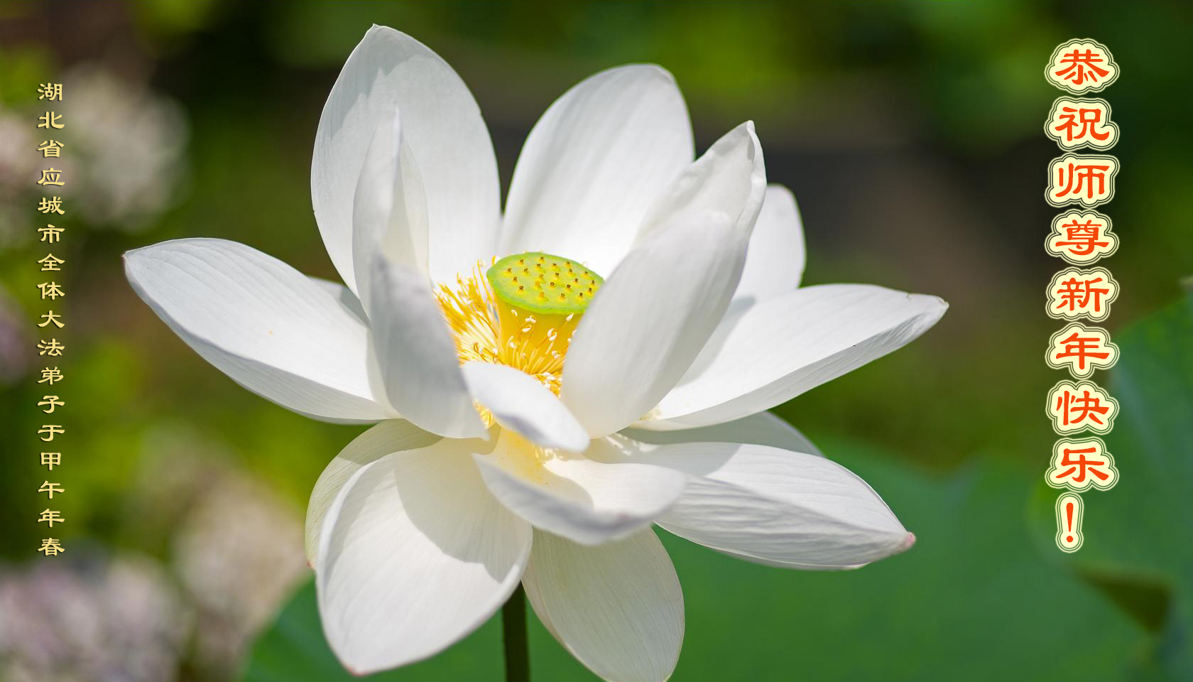 恭祝慈悲伟大的师尊甲午年快乐! 炮竹一声惊天响 新的一年又来到 旧势旧法已解体 恶龙邪灵一扫光 师尊度人受巨难 期盼众生能得救 弟子不负恩师望 法徒助师救人忙 得救众生泪满面 得救心情无言表 双手翘起大拇指 赞颂师尊威德高 高呼法轮大法好 真善忍好!大师好! 湖北大法弟子恭祝师尊甲午年快乐!