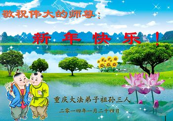 【明慧网二零一四年二月一日】 重庆大法弟子祖孙三人恭祝伟大慈悲的师父新年快乐!
