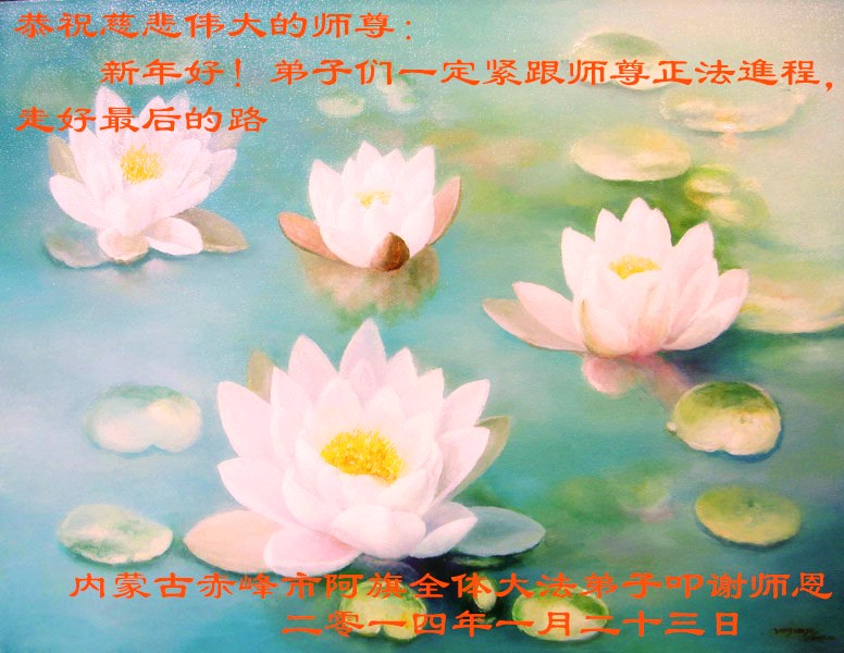 慈悲伟大的师父,您好!您辛苦了!弟子们恭祝您过年好!弟子们想念您! 新的一年开始了,历史延续到现在,是您用巨大承受换来的,是师父的佛恩浩荡,弟子们一定珍惜!我们下决心奋力精進,努力突破自我,做师父的真修弟子!学好法,修好自己,用纯净心态做好“三件事”,维护大法,使更多的世人明真相,圆容好师父要的,唯愿师尊笑。弟子们合十叩谢师尊! 赤峰市大法弟子敬上 二零一四年一月二十六日 内蒙古自治区锡林郭勒盟多伦县大法弟子祝师尊新年好!