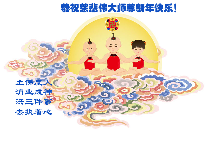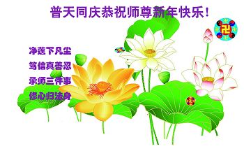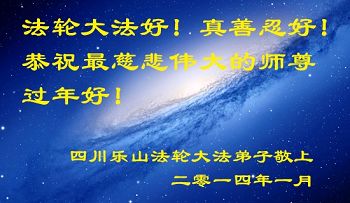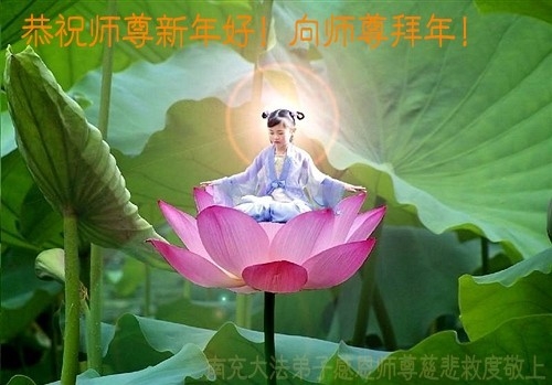 师父新年好,师父您辛苦了!弟子们唯有真正按照师父的话去做,少让师父操心,承担起自己在正法时期大法弟子应该做的一切,才足以报师恩!向师父合十、叩拜! 四川乐山法轮大法弟子恭祝最慈悲伟大的师尊过年好!
