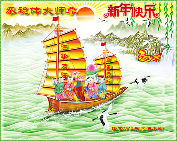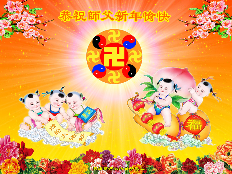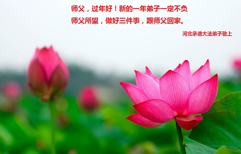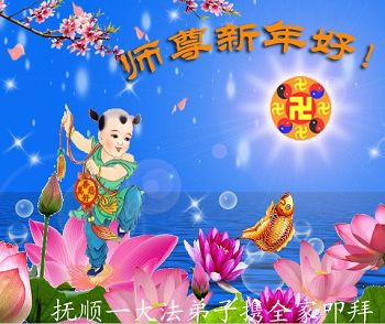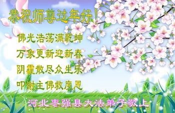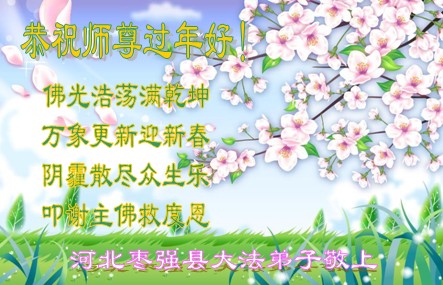 诗词歌赋语千言, 贺卡纷飞寄思念; 恭祝师父新年好, 神州遍地涌金莲。 大法洪传宙宇明, 洪恩浩荡满坤乾; 法轮常转天地春, 佛光普照新一年。 大法弟子讲真相, 五洲四海传真言; 助师正法救苍生, 正法修炼万古缘。 师父辛苦了! 天津宁河大法弟子向慈悲伟大的师尊拜年,祝师父新年愉快!弟子们一定珍惜正法修炼机缘,在最后的时间里做好三件事,救度更多的众生,谢谢师父。 河北衡水市枣强县大法弟子恭祝师尊过年好!