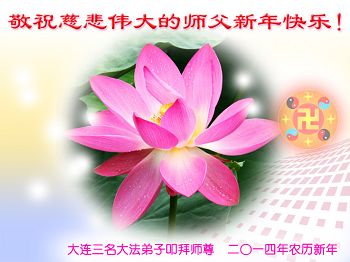 恭祝慈悲伟大的师尊过年好,过年快乐! 随着师尊正法進程的推進,环境也放宽了,更要做好三件事,抓紧救人、修好自己,按照大法心性标准严格要求自己,不忘来世的洪愿,让师尊少些操劳、多一些欣慰! 跪拜感谢师尊慈悲苦度!致以崇高的敬意! 大连学法小组全体大法弟子敬上 二零一四年一月十八日 辽宁省大连大法弟子恭祝伟大师尊新年快乐