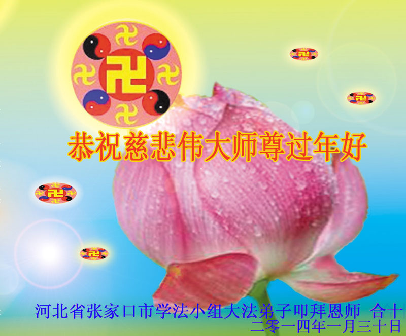 尊敬的师父新年好!在这新年到来之际,我们学法小组的大法弟子第一次怀着无以言表的心情给师尊拜年!在师尊的慈悲与佛恩浩荡下,我们又让师尊多操劳了一年。我们知道师尊给了我们能够圆满的一切,还给了我们不知道的,我们何以回报,唯有精進、再精進,踏踏实实的做好三件事,报答师父的慈悲救度,兑现自己的史前大愿,乘上师尊的法船驶向圆满的彼岸。再一次期盼师尊早日回大陆和大陆弟子团聚,我们都很想念您。叩拜师尊! 河北张家口一乡镇全体大法弟子恭祝师父新年好!