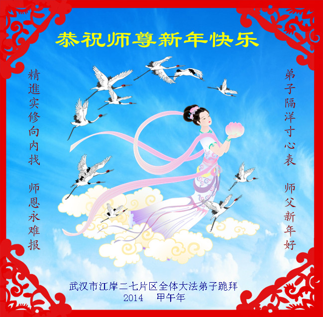 新年佳节弟子叩拜师父:师父您好!师父过年好! 无论环境多么险恶,压力中弟子想起您,就感到天涯不远,岁月不寒,满怀希望。 迎师回 腥风血雨突降临 师在法在徒心明 佛恩浩荡正乾坤 雾散日出天愈晴 不负师嘱世间行 慈悲唤众快快醒 乱世红尘炼金体 师回神州亿梅迎 武汉市硚口区一大法弟子敬上 甲午年 湖北省武汉市江夏区某学法小组大法弟子敬祝师尊新年快乐!