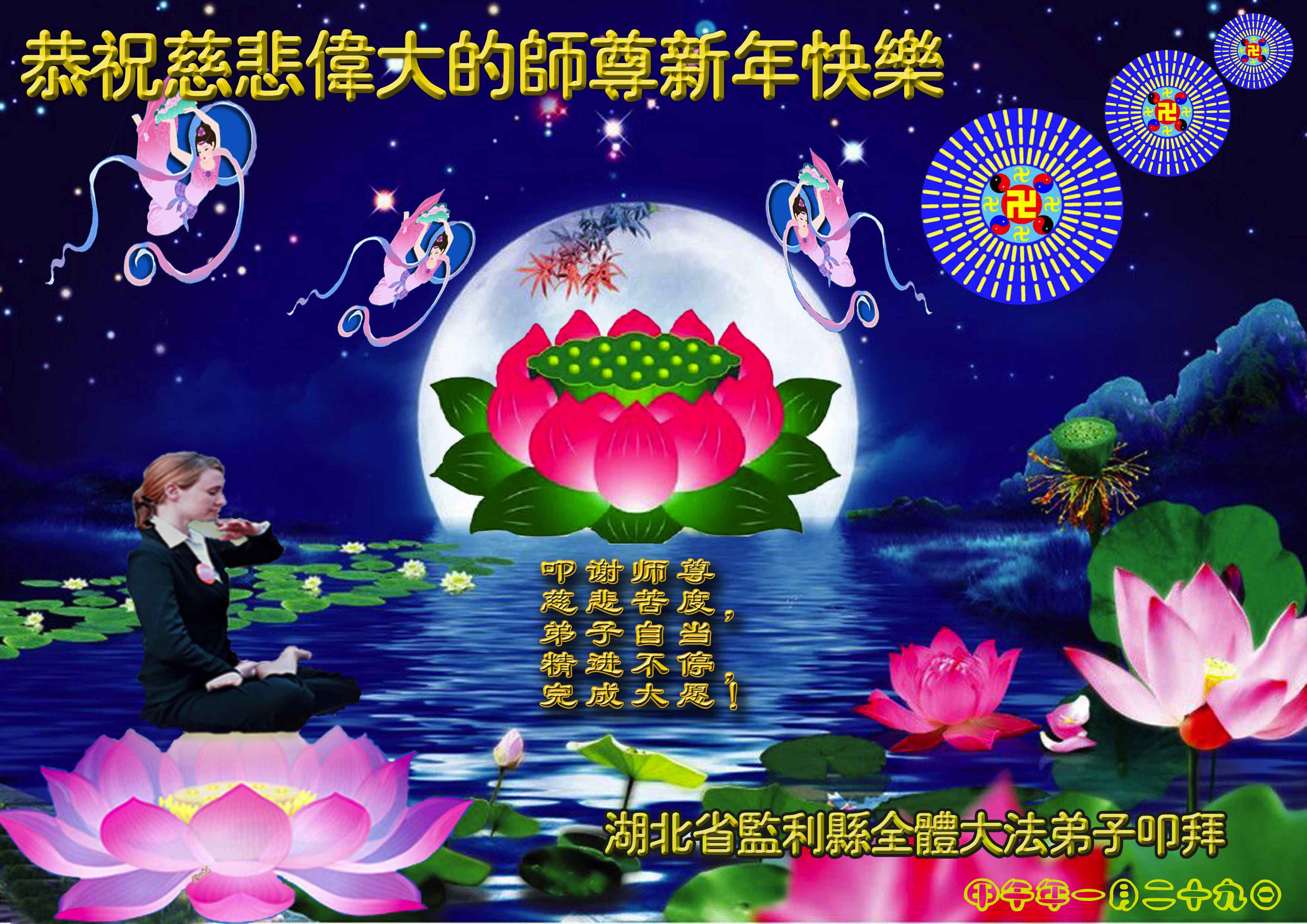 千言万语道不尽师尊的慈悲圣恩 万语千言表不完弟子的感恩之心 唯有精進再精進 多救人 跟随师父回天门 大陆弟子 —天然 携家人敬上 湖北省荆州市监利县全体大法弟子恭祝伟大的师尊新年快乐!