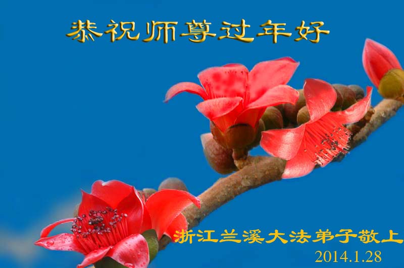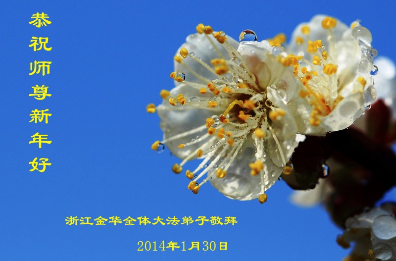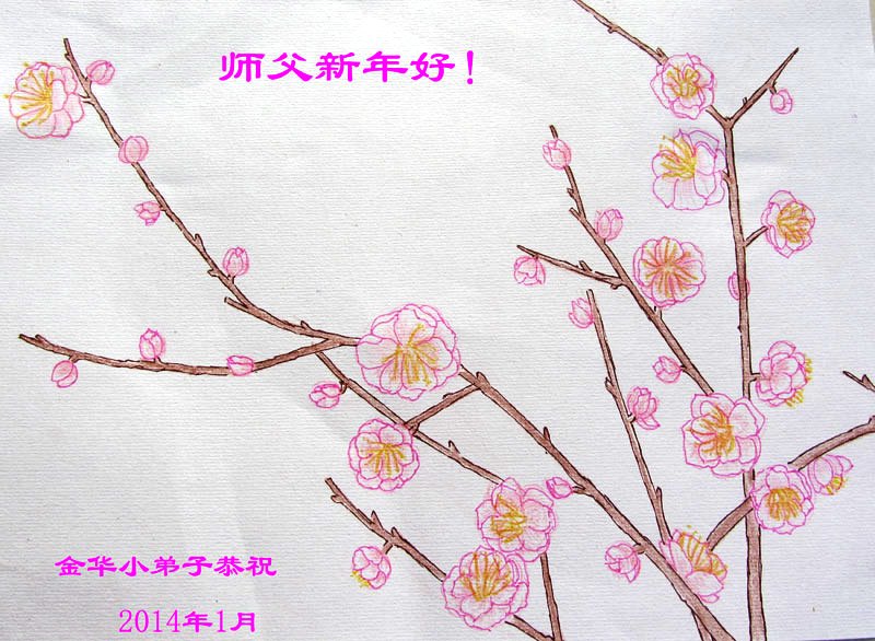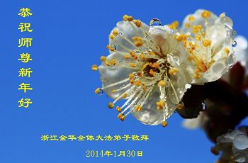 万马齐奔助师行 正天正地正人间 朵朵小花金光显 炸烂鬼除余恶 再看世间换新颜 金华兰溪大法弟子学法组敬上! 二零一四年一月二十九日 浙江省绍兴市一学法小组全体大法弟子恭祝慈悲偉大的师尊新年快乐!