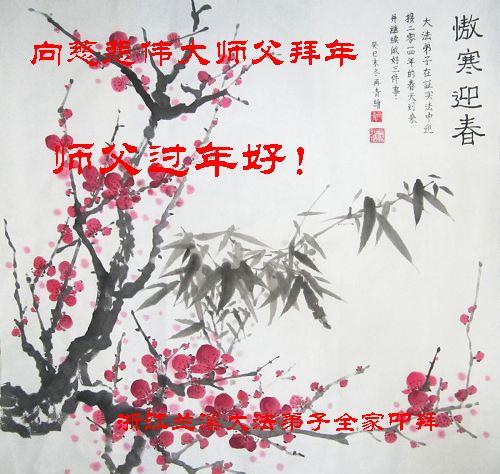 众生齐欢过大年 明了真相心真欢 你言我言大法好 恶念散去心怀善 大法弟子遍中原 精進实修执着淡 正念除魔救世人 助师正法了洪愿 金华大法弟子敬上! 二零一四年一月二十九日 浙江海盐大法弟子祝慈悲伟大的师尊新年快乐!
