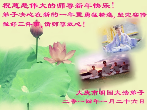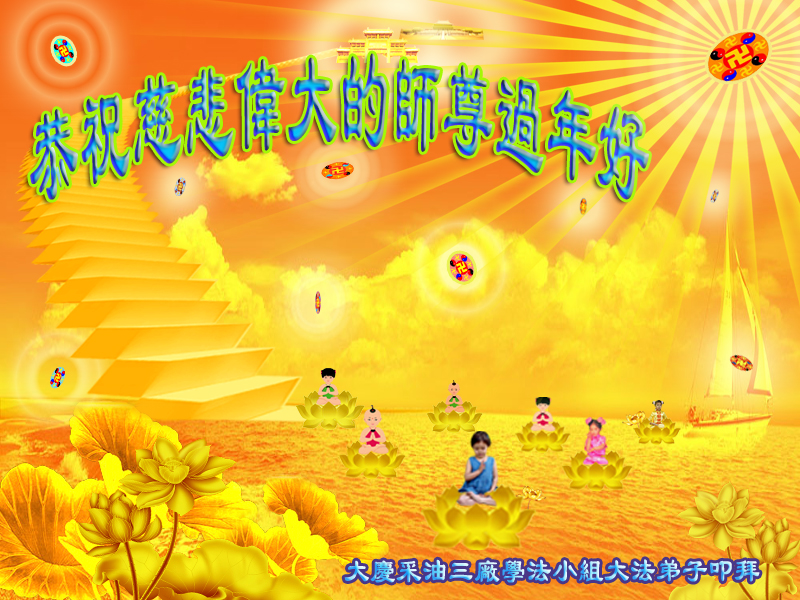 师父您辛苦了!又是新年了,弟子让您操心了,弟子一定冲破阻力,克服懒惰,放下对情的执着,精進、再精進! 黑龙江省大庆萨尔图地区全体大法弟子恭祝师尊新年好!