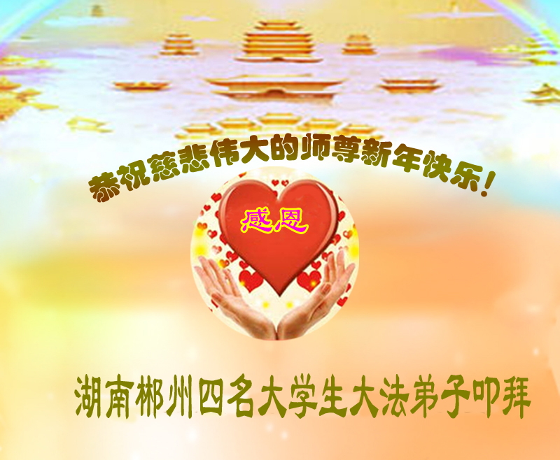 慈悲伟大的恩师:您好! 正值甲午年新春佳节之际,四川南充大法弟子携全家祝师尊新年快乐!感谢恩师的慈悲救度!感谢恩师为我们的巨大承受,使我们今生能成为恩师的弟子!感谢恩师为我们所做的一切!我们用尽宇宙所有语言也难以表达师恩之万一,唯有将师恩万古传颂,直到永远永远永远…… 谢师恩 救世大法圣王传,正法巨轮滚滚前。 慈悲开启千年锁,正法连上万古缘。 大法洪传廿一年,法船满载亿莲返。 法正乾坤宇清明,神的誓约正兑现。 为了众生都得救,师承巨难挽狂澜。 旧势设难党害法,魔炼金刚污出莲。 亿万法徒紧随师,难中救人兑誓言。 法中粒子恩师造,繁星闪烁满苍寰。 不忘师恩再造恩,助师做好事三件。 师授神力灭旧势,法赐正念荡妖焰。 立掌灭恶倒红墙,清除魔障扫迷烟。 唤醒众生万古愿,救尽世人登法船。 助师正法兑誓言,圆满随师返家园。 四川南充大法弟子携全家叩拜 2014-1-27 湖南郴州四位大学生大法弟子恭祝慈悲伟大师父新年快乐!