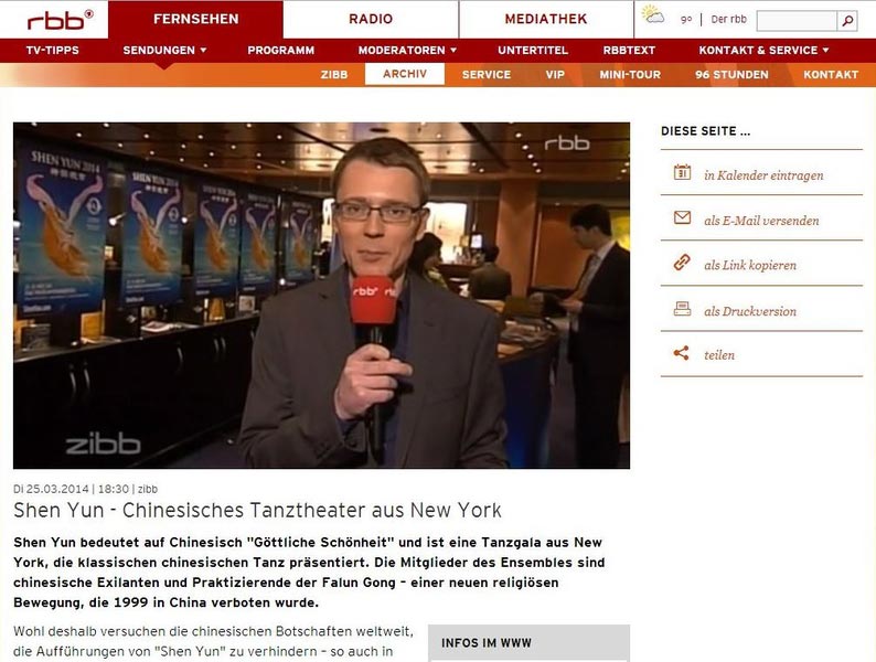 | 【明慧网二零一四年三月二十九日】(明慧记者雪莉德国综合报道)二零一四年三月二十六日,美国神韵世界艺术团在柏林的最后一场演出在观众热烈的掌声中落下帷幕,为德国柏林和法兰克福共七场的演出画上了一个圆满的句号。 演出开始之前,德国联邦教育部长约翰娜·万卡 (Johanna Wanka)、家庭部长曼努艾拉·史维席格(Manuela Schwesig)和德国副总理兼经济部长(Sigmar Gabriel)先后发来贺信,预祝神韵在德国演出成功。 电视台直播开演前盛况 柏林最大、德国一台旗下最重要的地方台—RBB(柏林勃兰登堡电视台),在黄金时段现场直播了观众进入剧院时的盛况。RBB 主持人形容神韵演出是视觉的盛宴,是一场中华五千年文明之旅。电视台报导了神韵演出到来之前,中共大使馆试图阻止神韵演出失败的丑行。电视台也采访了神韵在德国的主办方负责人吴曼扬先生,整个报导长达五分钟。 联邦财政部国会国务秘书米夏·麦斯特(Michael Meister)先生今年是第三次观看神韵。他表示,每次都看到了新东西。他说:“这是完全不同的文化领域,但传递的信息非常深刻。不仅在演出现场,可能看完演出后也会让人沉浸其中,有所收获。”他表示神韵所传递的信息是“深邃的智慧,超越一切时空。”  柏林最大、德国一台旗下最重要的地方台—RBB(柏林勃兰登堡电视台),在黄金时段现场直播了观众进入剧院时的盛况。(RBB网站截图) |