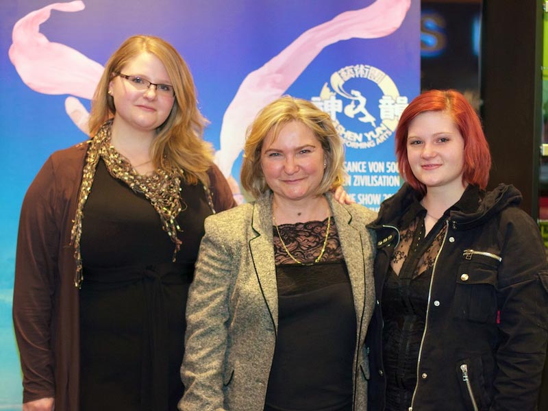 音乐艺术人士赞美神韵触动灵魂 诸多音乐界专业人士在观看了演出后表示“很震撼”,吕贝克室内乐乐团首席小提琴手思维亚特克(Anita Swiatek)女士表示:演出一定“有上天的帮助”。她说:“(演出)非常协调,非常使人平静,难以置信地让人平和。我们很高兴能来观看。”她还特别提到:“只有自己搞音乐和对音乐感兴趣的人才能看出来,(这场演出)背后所蕴藏的努力、艰辛和多年的付出,这不是单单靠毅力就能完成的,肯定有上天的帮助,才能办好这场演出。”  小提琴家Anita Swiatek(中)和两个女儿一起观看了神韵在柏林的首场演出。 |