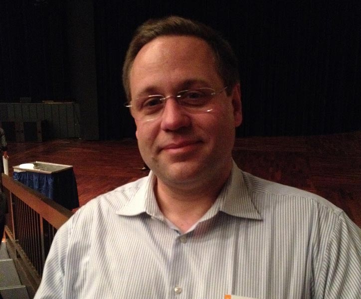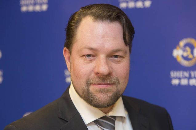 对于神韵独特的二胡演奏,艺术家们更是感动不已。乐队指挥弗格桑(Bernd Peter Fugelsang)先生常与各大乐团合作,他曾为以色列国家交响乐团副首席双簧管,后又在二零零五年,他在著名的德国国防部队西格堡Siegburg管弦乐团中担任首席双簧管。作为专业演奏古典室内乐的专家,Fugelsang表示,很喜欢神韵的演出,他认为,乐团的演出十分精准。他说:“神韵乐团的音乐是独一无二的,是在欧洲听不到的。这种结合,这种音色,这些传统的中国乐器都很有特色。他听出来,中国音乐中的五声音阶也和西方的七声音阶不同。”Fugelsang先生对二胡尤其情有独钟,他说,二胡曲触动了他的内心深处,他非常感动。他认为,二胡是中国乐器中的经典。在神韵中,从服饰、颜色、演员所付出的努力都体现出艺术家们的热爱,还有舞蹈演员和歌唱家的所散发的喜悦和温暖也可以看出。Fugelsang先生说:“看得出来,演员发自内心的喜悦。”  乐队指挥Bernd Fugelsang观看了法兰克福第二场演出,他表示,二胡触动了他的内心深处。 |