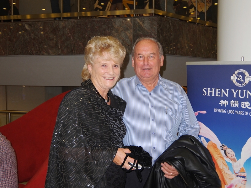 古典钢琴兼风笛音乐家Katherine也说,“神韵艺术家们所做的努力是在维护和保持他们的传统,以免其流失。他们的努力非常地成功,非常地精彩。” 已连续八年观看神韵的摄影师Christine说,她一直都想找一个词来描述神韵,那种神仙境界的美好与优雅,她说:我想还是用“神”这个字吧!Christine说,中国古典舞非常美,神韵舞蹈展现的神佛世界,非常神圣。她也表示,在当今世界,人们要尊重每一个人的信仰和人权,尊重每个人追求真理和信仰的权利。不管我们的外形相貌多么不同,我们的精神力量都来自于天上。 资深文艺教师Kovus Van Schalkwyk则称赞神韵演出“不同凡响!这是天外之舞!”“你使用任何词汇都不过分。” 在惠灵顿拥有自己工作室的儿童图书插图画家Olivia Jackson-Mee激动的说:“(演出)绝对是完美无瑕,特别是舞蹈和音乐配合的精妙绝伦,神韵的音乐简直是不可思议的动听,东西方乐器竟然做到如此天衣无缝般的完美结合,听起来非常有趣和悦耳,还有神韵的服饰,哇!当灯光打在那些精美的服饰时所发出的光芒,简直是视觉盛宴!” 各界精英:神韵传递精神力量启迪人心 除了华美的视觉震撼之外,神韵所展现精神层面的内涵更是令观众深受启发。 拥有自己公司的Marj Mulholland和先生Graeme观赏之后,对神韵的演出赞不绝口。“神韵让我们回溯了五千年文明,令人陶醉。”Mulholland先生说:“神韵的节目很有内涵,既让人有所启发,又妙趣横生,太棒了!”“神韵的表演把这诠释的非常精彩。我们文化中,人性的真正精神层面的内涵已经被邪恶或者说是政治给践踏殆尽了,却没有认识到在自己之上还有一种力量,还有一种比我们自身更高的境界,我们应该去寻求。” Mulholland夫人说:“还有一点让我非常喜欢,神韵让我知道了中国人有这么好的信仰,对造物主如此的坚信,虽然被打压,却仍然坚守,表现了真正的坚忍不拔。这让我觉得很了不起。”  图3:Marj Mulholland和Graeme Mulholland夫妇观看了美国神韵国际艺术团在新西兰奥克兰ASB剧院的首场演出。Mulholland夫妇对神韵的演出赞不绝口 |