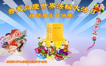 敬祝师尊华诞日 得法修炼十六载 大法度我出苦海 日夜做好三件事 救度众生兑誓约 法徒蒙难在中原 恩师时时把我看 迫害善良恶必败 助师正法在世间 修炼如初永精進 圆满随师回家园 祝师尊生日快乐!共庆世界法轮大法日 生命为法来 得法在今天 修炼二十载 与师结圣缘 学法入心间 炼功身体健 正念除邪恶 修心慈悲显 过关师尊搀 遇难法指南 三件事做全 福送真相传 笑迎迷众讲 三:退.保平安 事事弃人心 处处想别人 一思一念纯 正念正行坚 法徒是整体 助师正法行 功成圆满时 随师回天庭