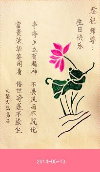 这俩位同修中姐姐今年八十六岁,妹妹七十五岁。修大法身心健康,精力充沛。十几年来坚定的走在师父安排的返本归真的路上,精進实修,做好“三件事”。心中对慈悲伟大的师尊无限的感恩,在普天同庆世界法轮大法日暨师尊六十三岁华诞之际,她们分别用自己的方式表达节日的祝贺和坚定的信念!条幅“以法为师 精進实修”为姐姐同修几年前(改字前)绣制。 贺卡中的画与诗词皆为妹妹同修创作。 亭亭玉立有精神 不畏风雨不沉沦 富贵荣华等闲看 俗世净莲不染尘 辽宁鞍山大法弟子祝师尊生日快乐!