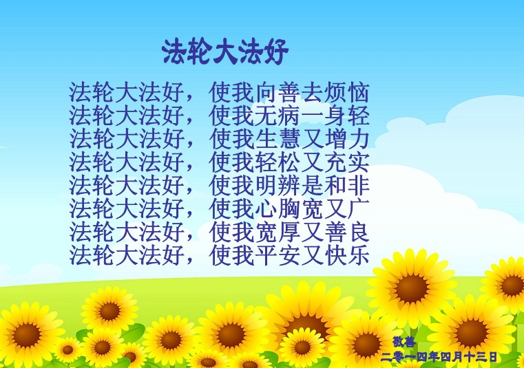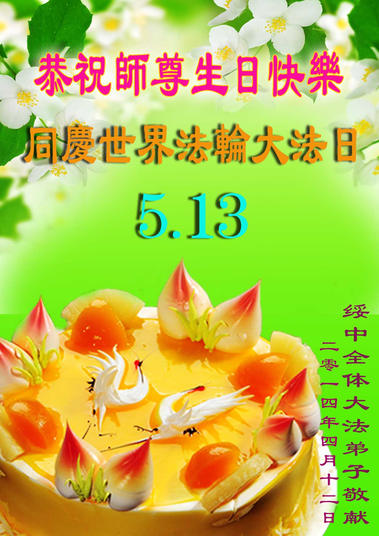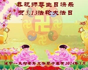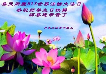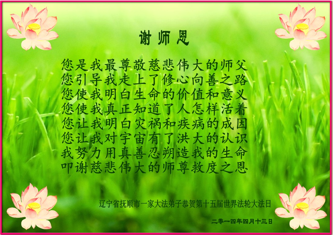 穹宇同化大法,浩荡佛恩普照人间之时,苍生雀跃。全世界大法弟子又迎来了二零一四年“五一三”这一温馨幸福、伟大而殊胜的日子。辽宁抚顺地区四个学法组全体大法弟子跪拜慈悲伟大的师尊,恭祝师尊生日快乐!感恩大法,感恩师尊的浩荡佛恩!感恩师尊的慈悲苦度。感恩师尊为弟子做出的巨大付出与承受。并代表所有的有缘众生感恩大法、感恩师尊给予的慈悲与福泽!用尽人间语言都无以言表、无以报答师尊的佛恩浩荡!在师尊正法结束的瞬间:只有遵循师尊的教诲,以法为师。坚信师父坚信大法。紧跟师父的正法進程做好三件事,精進、再精進。多学法,学好法。改变人的观念,向内找,向内修,修掉各种人心、执着、欲望。放下自我比学比修,与同修相互配合好,抓紧救人,多救人。让师尊多一些欣慰,少一份付出与承受。兑现我们的史前誓约,完成大法弟子的历史使命,圆满随师回家! 二零一四年四月二十七日 辽宁省鞍山市全体资料点大法弟子祝慈悲伟大的师尊生日快乐!庆祝五•一三世界法轮大法日!