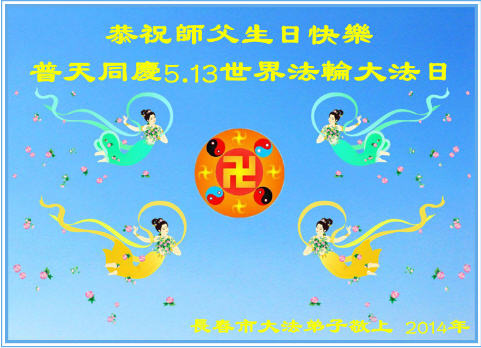 五月十三日这神圣的日子,二十二年前的这一天,慈悲伟大的师尊将伟大的佛法象阳光、象雨露洒满世间每一个角落,滋润着迷中世人干枯的心田。从此我们沐浴在佛光中,聆听着师尊的谆谆教诲,了悟了人生的真谛--返本归真。 此生能与师尊和大法同在我们多么幸运,真是值千金,值万金! 此时此刻千言万语难表弟子的心,汇成一句话,叩谢师尊! 长春大法弟子 2014年4月30日 吉林省长春市九台市一大法弟子恭祝慈悲伟大的师尊生日快乐!恭祝法轮大法洪传世界二十二周年!
