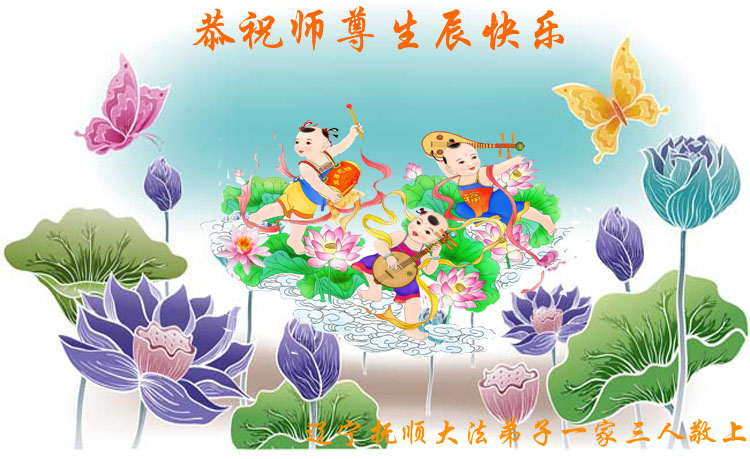 辽宁抚顺大法弟子一家三人恭祝师尊生日快乐!