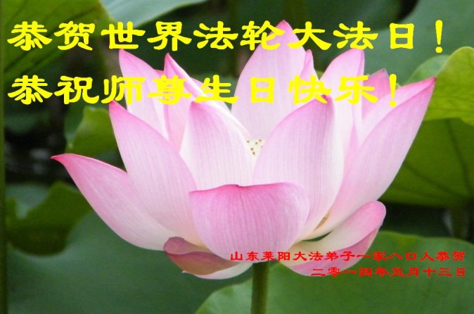 请师尊放心,弟子一定牢记师尊教诲,扎扎实实的做好三件事,不辜负师尊的期望,圆满随师还! 山东烟台大法弟子 2014.4.30日 山东省烟台市莱阳市大法弟子一家八口人恭祝慈悲伟大的师尊生日快乐!恭贺世界法轮大法日!