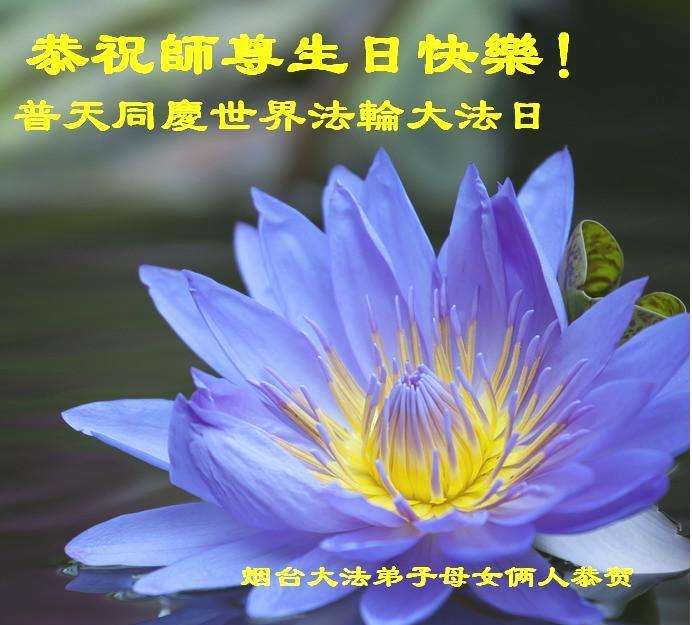 山东省烟台市大法弟子母女俩恭祝慈悲伟大的师尊生日快乐!恭贺世界法轮大法日!