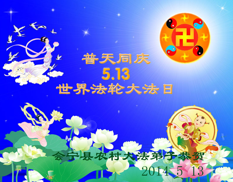 天津市宁河县一个乡镇的全体大法弟子庆祝2014年5.13世界法轮大法日,恭祝伟大的师尊生日快乐! 我们要履行誓约,全身心地助师正法,救度众生,做到真正的“正法时期的法轮大法弟子”。 辽宁省营口熊窑农村全体大法弟子恭贺慈悲伟大的师尊生日快乐!热烈庆祝五月十三日世界法轮大法日!