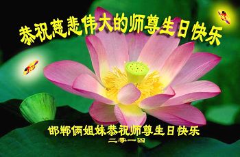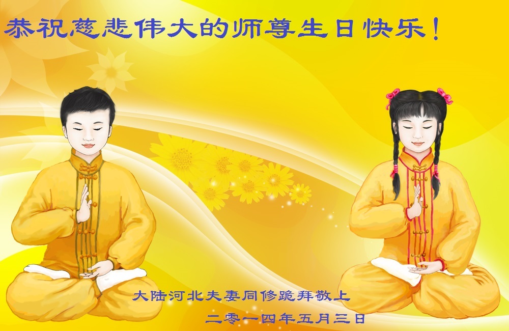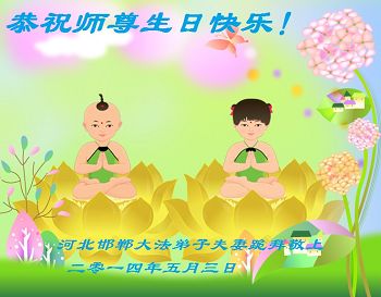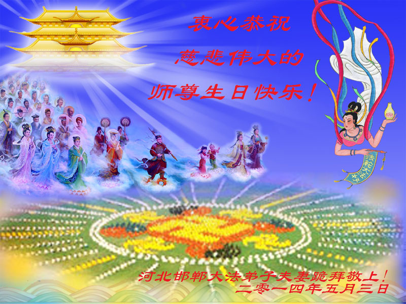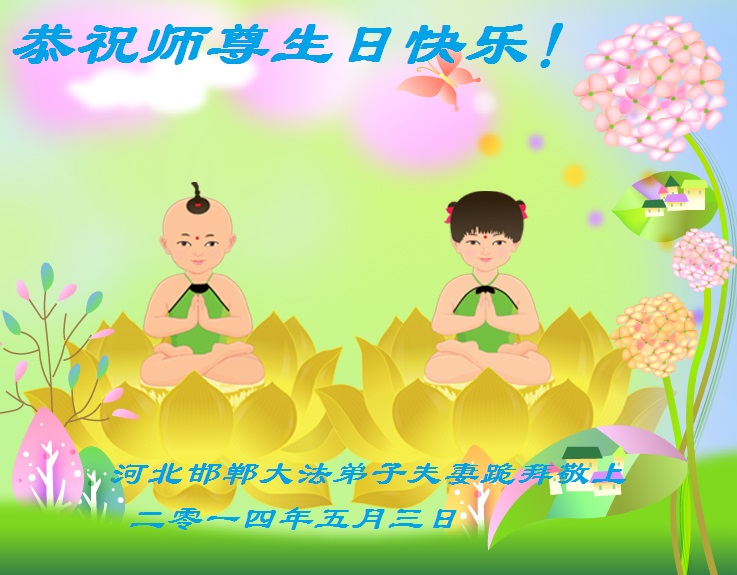 【明慧网二零一四年五月十日】 河北邯郸大法弟子夫妻衷心恭祝慈悲伟大的师尊生日快乐!
