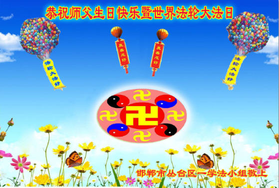祝贺世界法轮大法日!祝贺法轮大法洪传世界! 在这普天同庆的日子里纵有千言万语也表不尽弟子对师父的敬仰与感恩。我们全体大法弟子唯有紧跟师父的正法進程,勇猛精進,做一个合格的大法弟子。 邯郸一学法小组