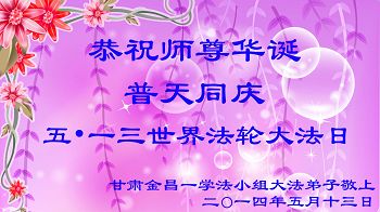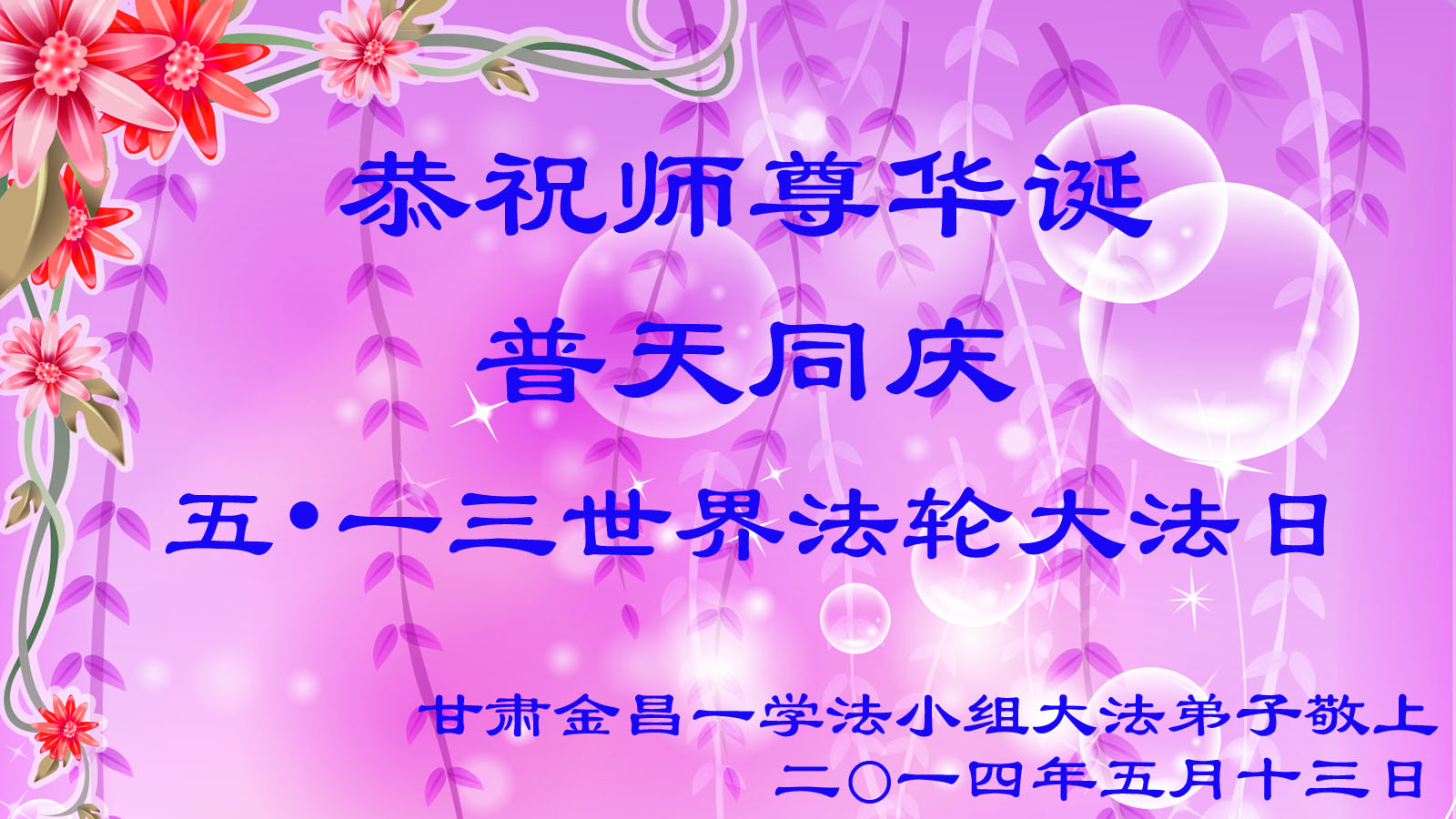 【明慧网二零一四年五月十日】 甘肃省白银市大法弟子恭祝世界法轮大法日暨慈悲伟大的师父生日快乐!