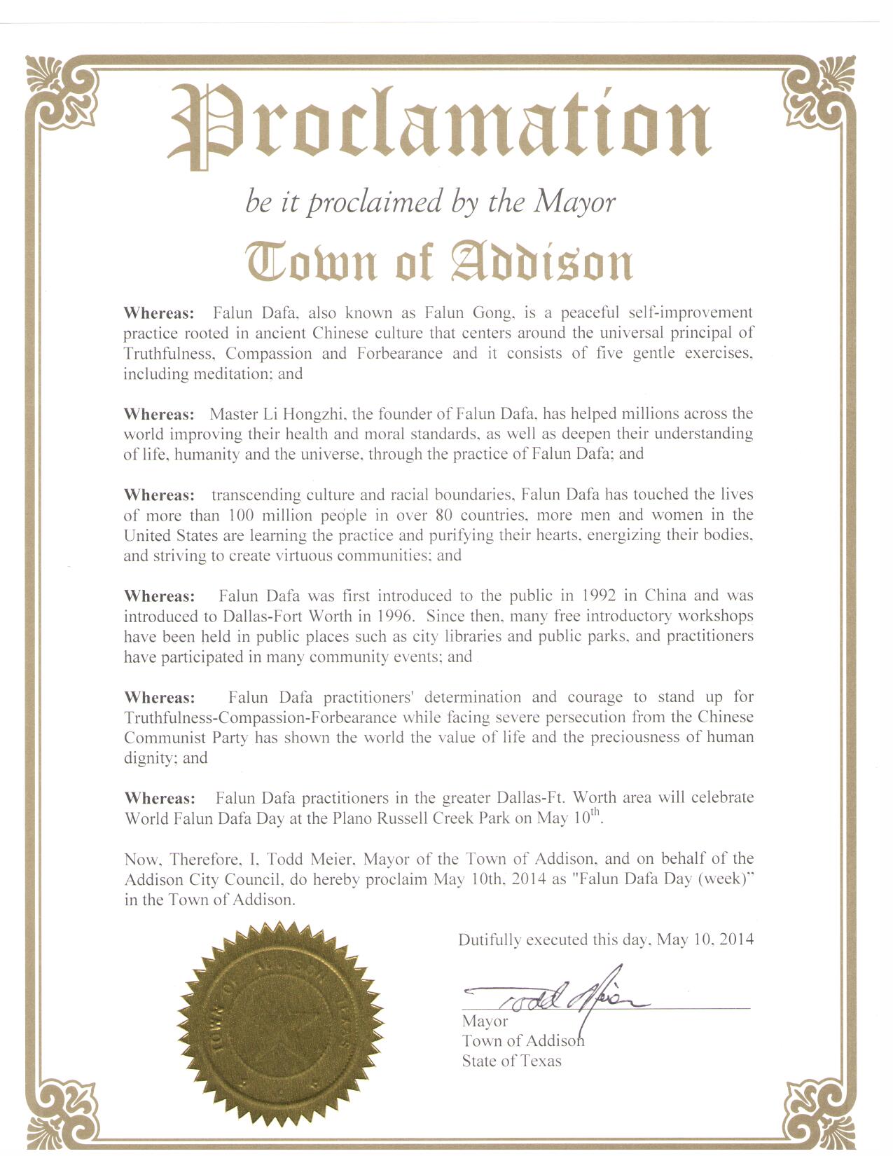美国德州达拉斯-福特沃斯地区法轮功学员于二零一四年五月十日在布兰诺Russell Creek公园举办活动庆祝世界法轮大法日和法轮大法弘传二十二周年。德克萨斯州爱迪逊市(Addison)市长陶德•密伊尔(Todd Meier)颁发褒奖,宣布五月十日为法轮大法日。 译文如下: 鉴于,法轮大法(法轮功)源于古老中国文化,是以宇宙特性“真、善、忍”为原则的一个平和的自我提高的功法。法轮功共有包括打坐修炼在内的五套功法; 鉴于,法轮大法创始人李洪志先生帮助全世界上亿的人增强身心健康。他们通过修炼法轮功加深了对生命、人生、以及宇宙的认识; 鉴于,法轮大法超越文化和种族的界限,在全世界八十多个国家吸引了上亿人们修炼法轮功。在美国越来越多的人们通过学炼法轮功,使他们心灵得到纯净,身体健康,并为社区道德的回升起着积极的作用; 鉴于,法轮大法从一九九二年在中国传出。一九九六年法轮大法洪传到达拉斯-福特沃斯地区。从那以后,在达福地区的许多图书馆、公园举办了许多期免费法轮大法教功班。法轮大法修炼者参加了许多社区活动; 鉴于,面对中共的残酷迫害,法轮大法学员展现出的对“真、善、忍”的坚定,向全世界展示了生命的价值和人格的尊严; 鉴于,达拉斯-福特沃斯地区法轮大法学员在五月十日在布兰诺Russell Creek公园庆祝世界法轮大法日; 鉴此,我,陶德•密伊尔(Todd Meier),爱迪逊市市长,宣布二零一四年五月十日为爱迪逊市 法轮大法日陶德•密伊尔(签字) 爱迪逊市市长 美国德州艾伦市宣布法轮大法日