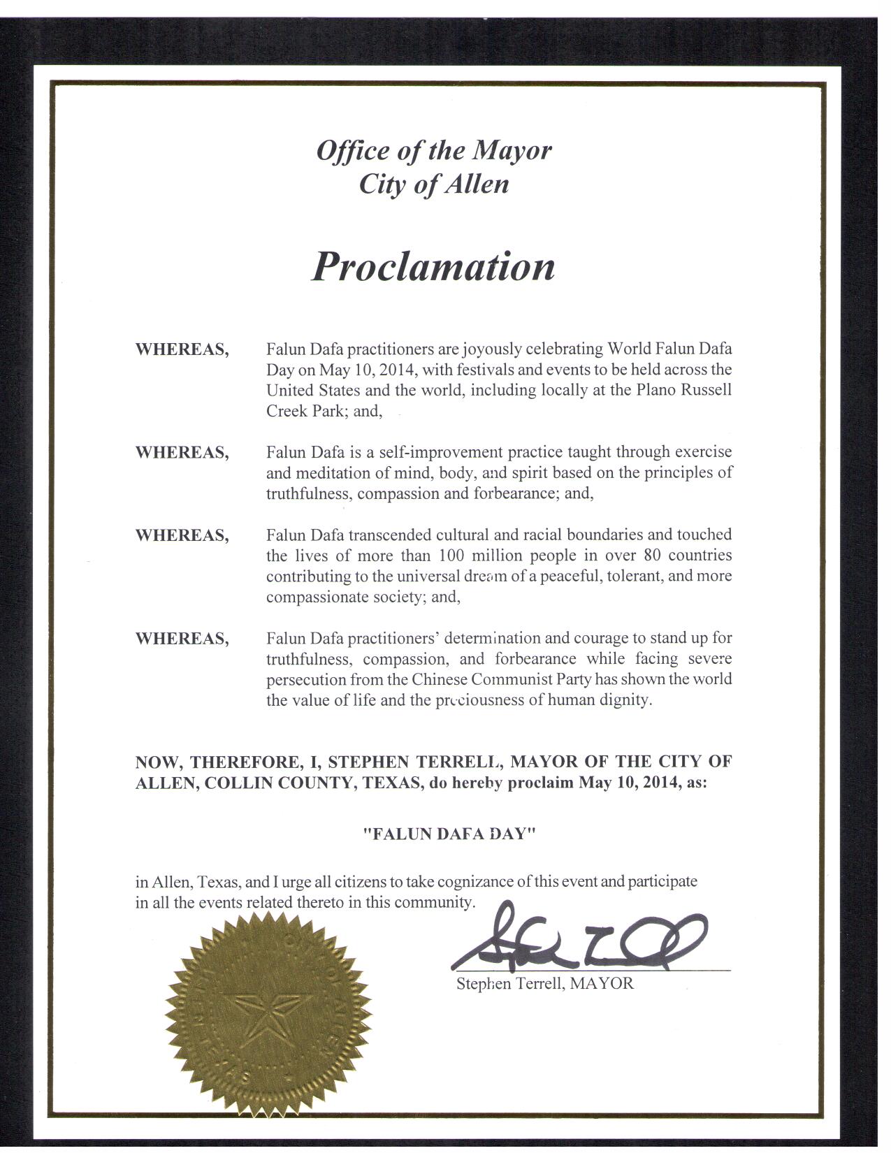 二零一四年五月十三日世界法轮大法日即将到来,美国德克萨斯州艾伦市市长史蒂夫•泰瑞尔宣布五月十日为法轮大法日,他还称赞法轮大法学员面对中共的迫害,仍坚持“真、善、忍”信仰的精神和勇气。 褒奖译文如下: 褒奖 鉴于,在美国以及全世界各地的法轮大法学员将满怀喜悦以各种形式的活动来庆祝二零一四五月十三日世界法轮大法日,包括在布兰诺Russell Creek公园举办的活动; 鉴于,法轮大法以宇宙“真、善、忍”特性为准则,是性命双修的自我提升功法; 鉴于,法轮大法超越文化和种族的界限,在全世界八十多个国家吸引了上亿人们修炼法轮功,把平和、宽容、慈悲的普世价值观带给全社会; 鉴于,面对中共的残酷迫害,法轮大法学员展现出的对“真、善、忍”的坚定,向全世界展示了生命的价值和人格的尊严; 因此,我,史蒂夫•泰瑞尔(Stephen Terrell),艾伦市市长宣布二零一四年五月十日为 “法轮大法日” 并呼吁所有艾伦市居民与法轮大法学员一起在社区庆祝与其有关的活动。 史蒂夫•泰瑞尔 市长 美国德州阿灵顿市宣布法轮大法日
